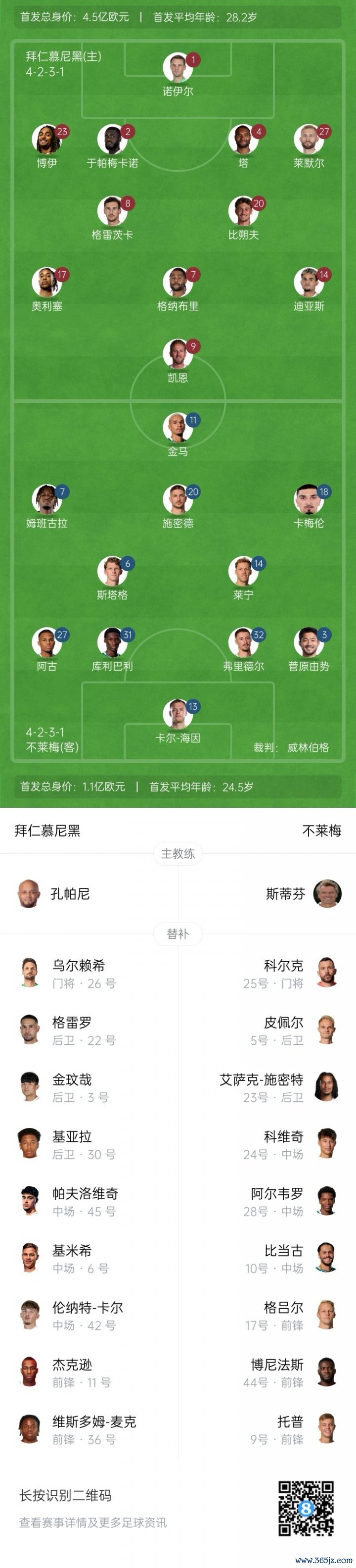 拜仁后备 :26-乌尔赖希、3-金玟哉、6-基米希、11-杰克逊、22-格雷罗、30-卡西亚诺·基亚拉、36-维斯多姆·麦克、42-伦纳特·卡尔、45-帕夫洛维奇