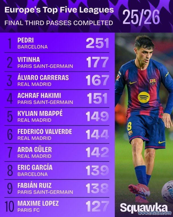 10月1日讯 数据网站Squawka统计本赛季五大职业联赛 攻击 三区完成传送球 数,巴萨中场球员佩德里断档领跑 ,开启运动人生西甲直播皇马4人进入前十。