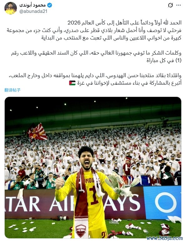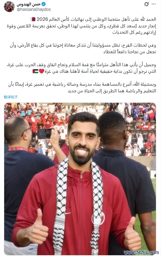 今日, 西甲新闻网卡塔尔国门马穆德-阿布纳德也发文:“我以国家队领队 海多斯为榜样,无论在场上场下他都始终以行动激励着我们,我将捐款为加沙的兄弟们建造一所医院。”