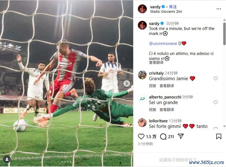 10月26日讯 瓦尔迪今天在Instagram发文,庆祝自己打入克雷莫内塞生涯首球。