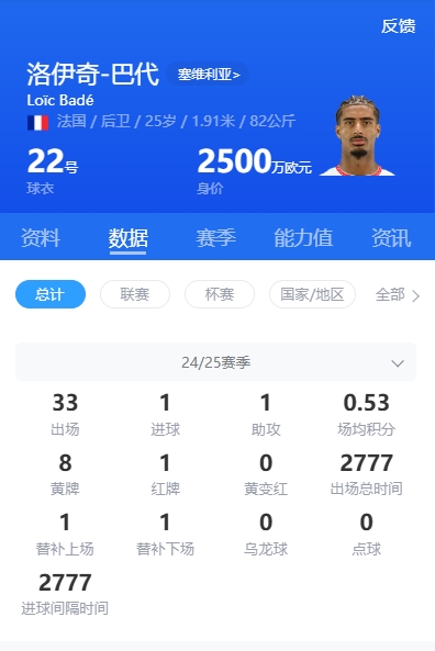 巴代现年25岁, 西甲新闻网身高1米91,上赛季为塞维利亚出场33场,现身价2500万欧元。