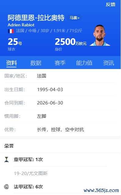 拉比奥特现年30岁, 西甲新闻网西甲直播上赛季为马赛出场31场,贡献10球5助,现身价2500万欧元。在赛季初,拉比奥特因为与队友冲突,被马赛挂牌出售。