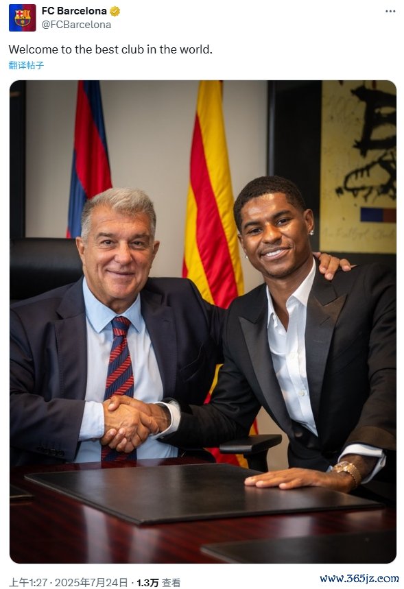 巴萨官推晒拉什福德与拉波尔塔握手图,开启运动人生西甲直播配文:“欢迎来到世界上最好的俱乐部🤝”。