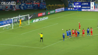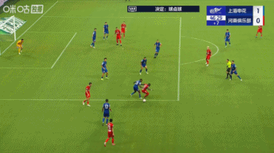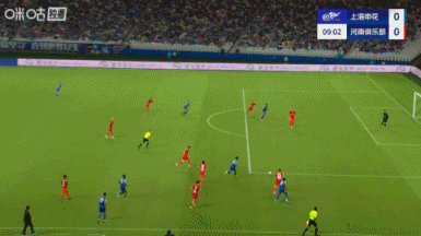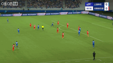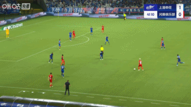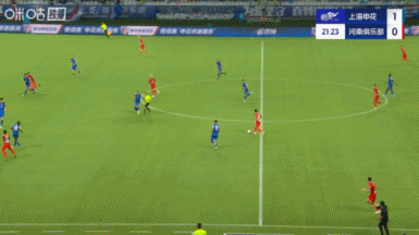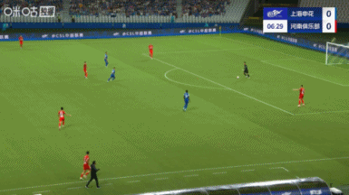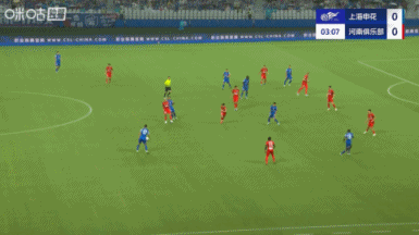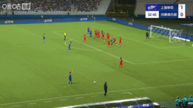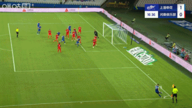 第17分钟,上海申花右侧底线球机会,高天意将球罚向危险区域 ,河南守门员王国明出击没有碰到这球,蒋圣龙后点高高跃起,力压对手顶球攻门得手,上海申花1-0河南。↓