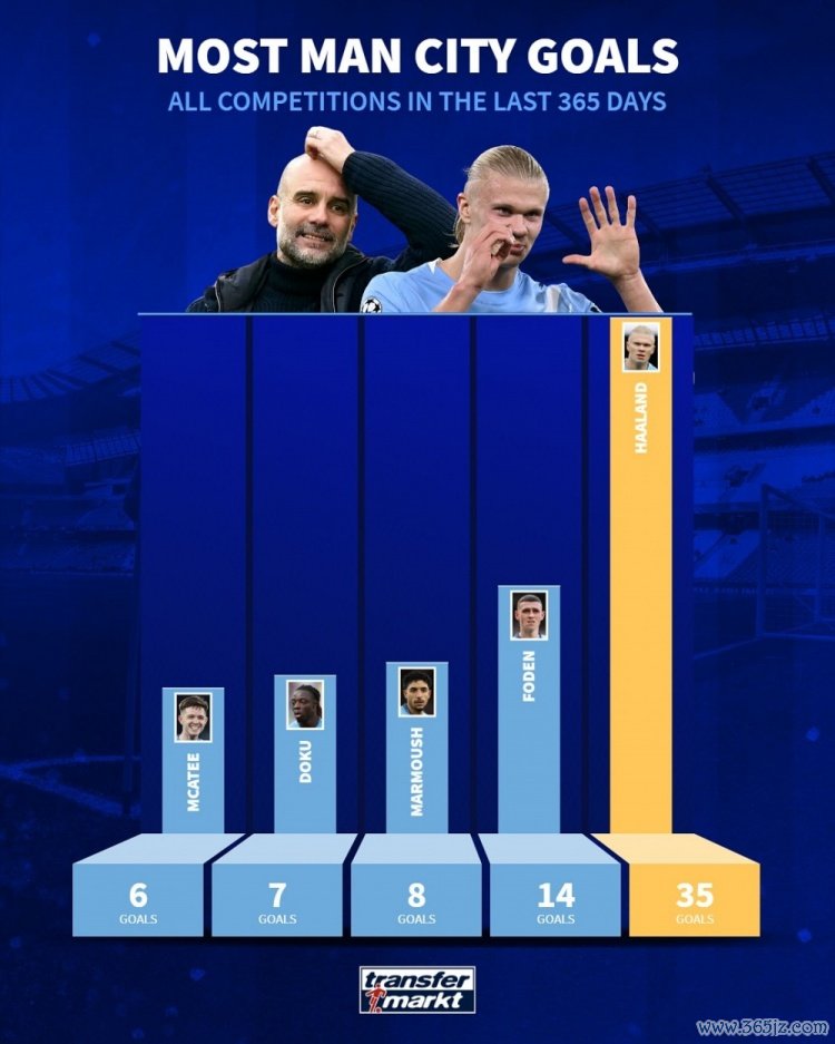 10月7日讯 德国转会市场列出了过去一年曼城队内的射手榜,开启运动人生足球直播吧哈兰德35球断层居首。