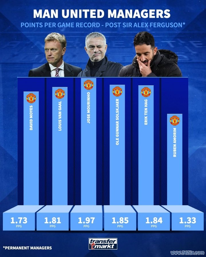 后弗格森时代曼联主帅场均积分 ↓