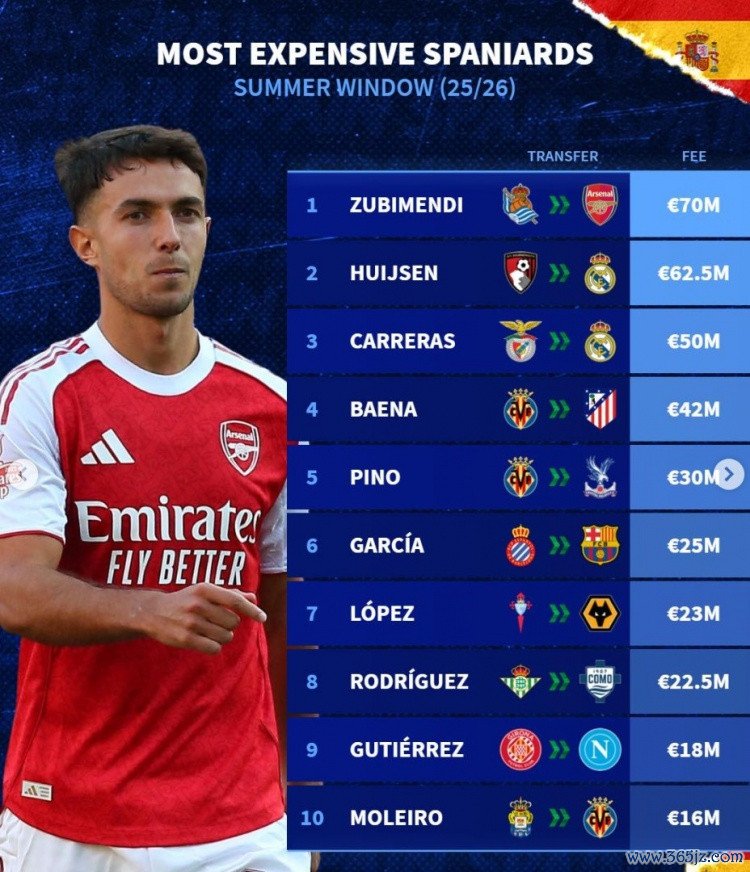 直播吧9月8日讯今夏主流职业联赛 转会窗已经关闭,无插件直播《转会市场》也列出了西班牙球员的今夏转会费最贵情况。