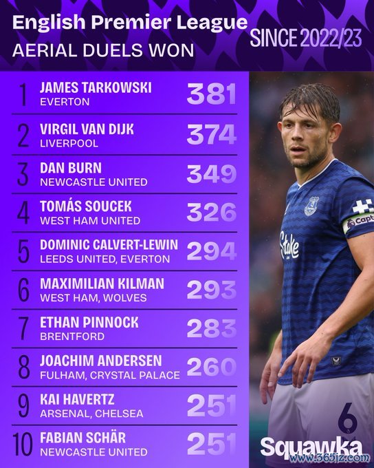 虎扑09月09日讯据Squawka数据统计 ,自22/23赛季英超空中对峙 成功榜,开启运动人生体育赛事埃弗顿后场球员塔尔科夫斯基排名第一, 网球新闻范戴克排名第二。