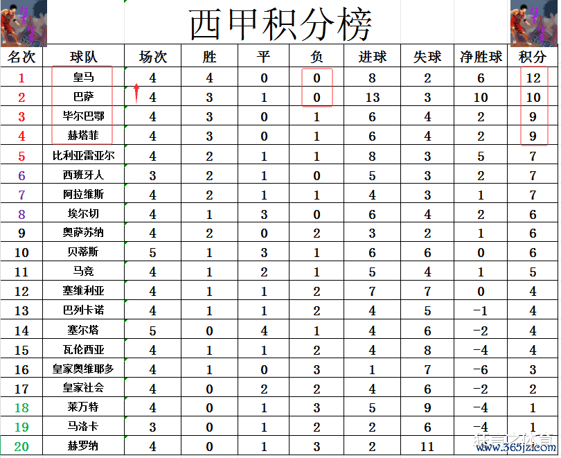 积分榜方面,皇马还是唯一全胜的球队,继续稳居榜首,巴萨今天狂胜后,3胜1平保持不败,他们超过毕尔巴鄂,赫塔菲1分,差皇马2分升至第2。