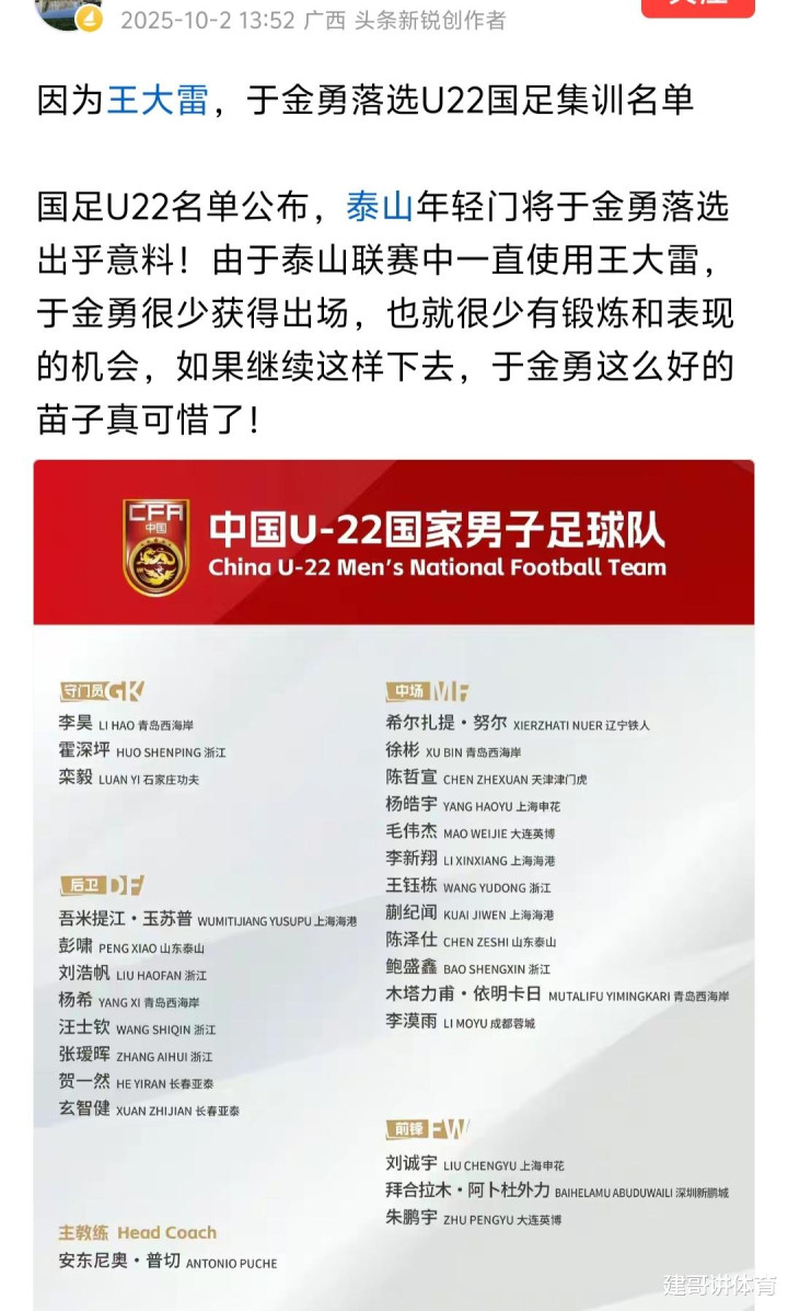 北京时间10月3日球探比分球探体育,当足协公布了U-22国家队的大名单后,令人感到意外的是,泰山队的潜力守门员于金永竟然不在名单之中,之前于金永能入选 U-22国家队,现在却不能入选国家队了,是什么原因造成的呢?有一位媒体人把于金永落选国家队的原因,全推在了泰山队36岁的老守门员王大雷身上。